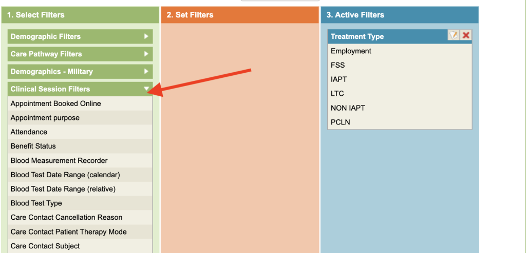 Within the first (green) column, the clinical contact filter will display several fields found within the clinical contact tab. The group filter will also include these additional fields.