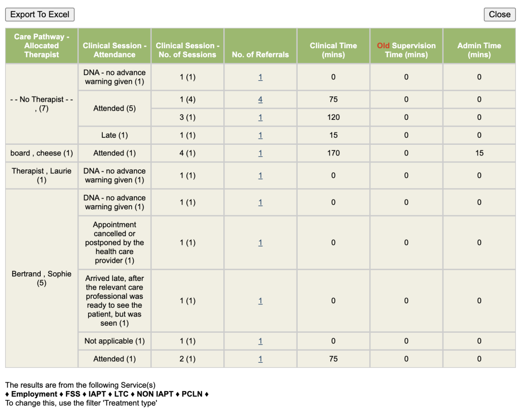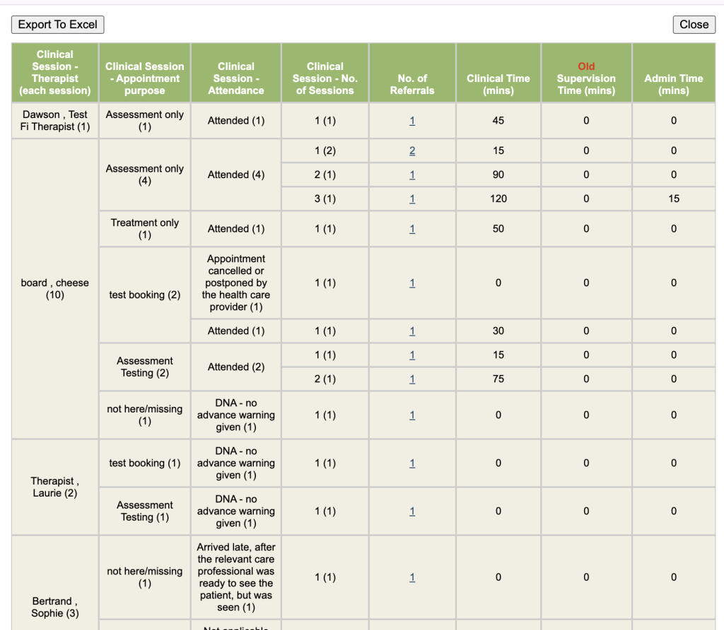 You may consider grouping by Clinical Session – Session Therapist, to see how many sessions are being completed for a referral against the therapist who actually did the session.