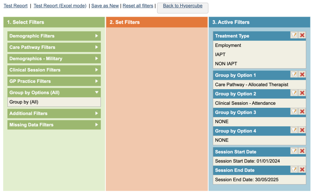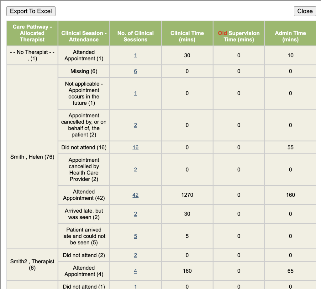 This report is useful for checking clinical sessions are being recorded against the appropriate care pathway stage.