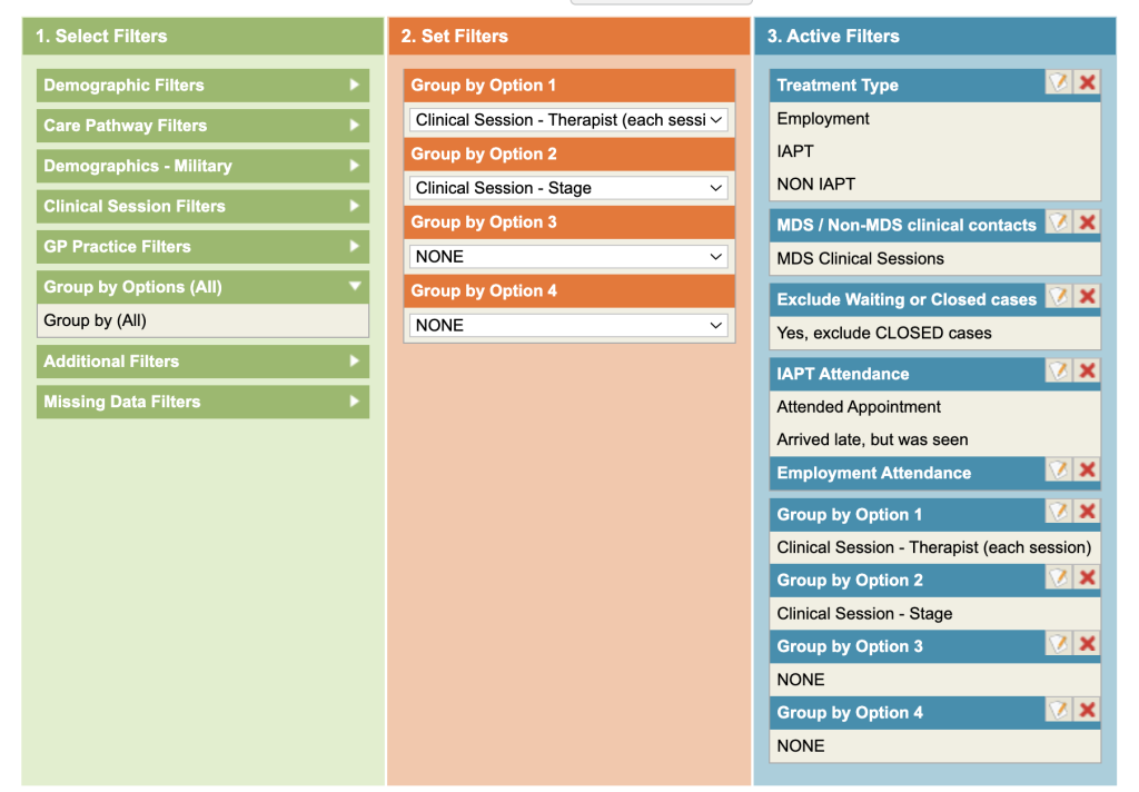 - Group by Clinical Session – Therapist (each session) & Clinical Session – Stage