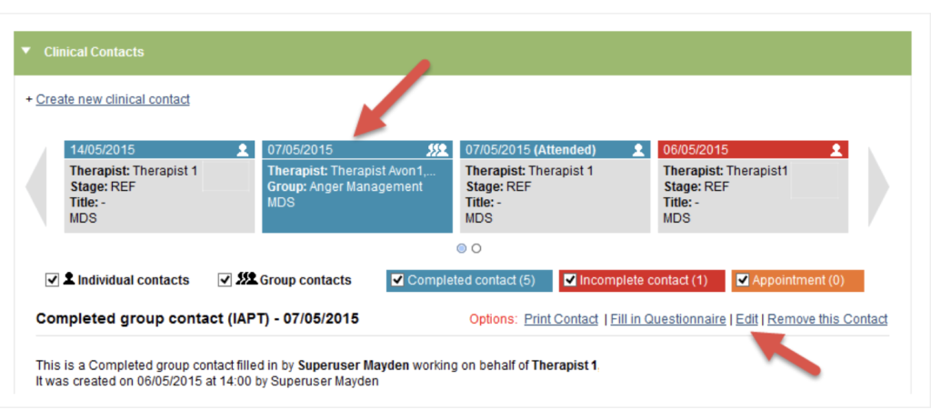 Both options will open the clinical contact form if you have selected a one-to-one contact. If you have selected a Group contact, the form to record group sessions will open in the relevant group in the Groups area.