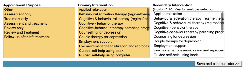 Again you have the option to ‘Save and continue later’. This will record the information you have entered so far, and updates the contact so it is highlighted as a red incomplete contact in the Clinical Contact carousel.