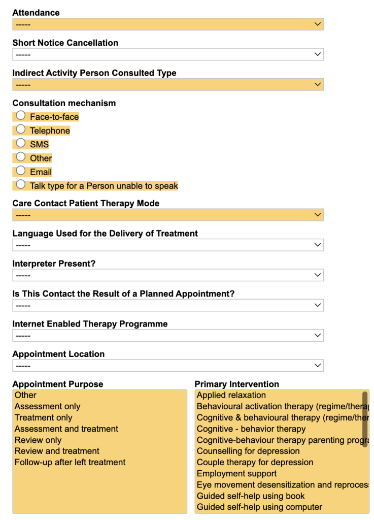If you indicated that the contact should be recorded as a full MDS contact in the common fields section above, then several of these options will be mandatory and therefore yellow.