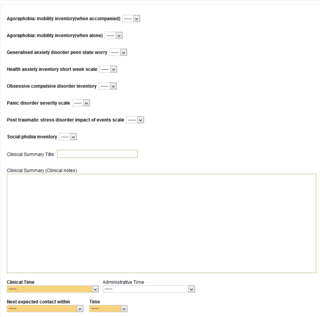 In this final section you can record the contact notes, as well as the total scores for any of the ADSM (Anxiety Disorder Specific Measures) questionnaires.