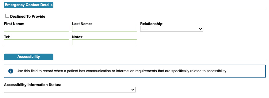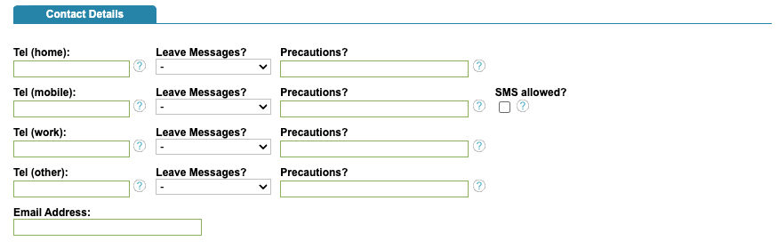 If you are using additional features to send communications via text message and/or emails to a patient, you will need to record the details in the ‘Contact Details’ tab.