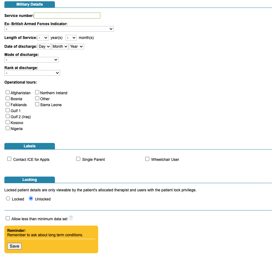 The ‘Allow less than minimum data set’ option will allow you to save the form without completing the mandatory fields. This is so a recorded can be saved quickly without all the information. The idea is that the user comes back to complete the record once they have the missing information. There are searches that you can build in Find Patients and save to support you with this.