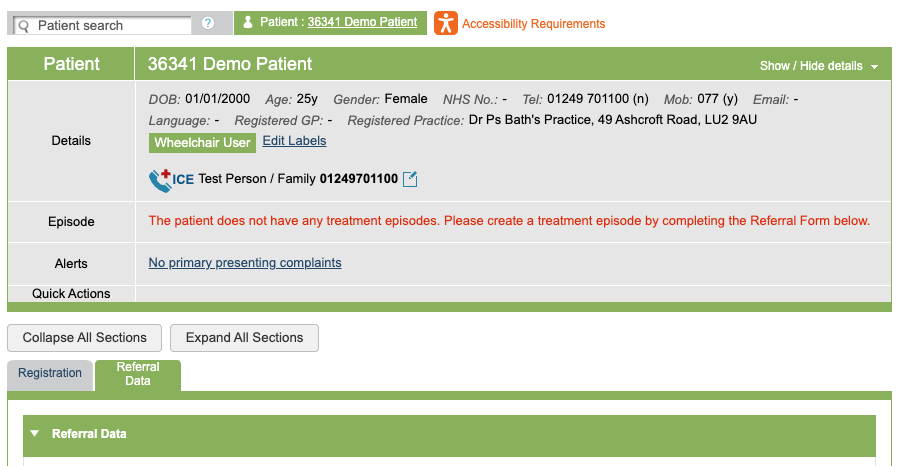 Once you have saved the patient record, you will now have a boarding card and the ability to add referrals then session data for this patient.
