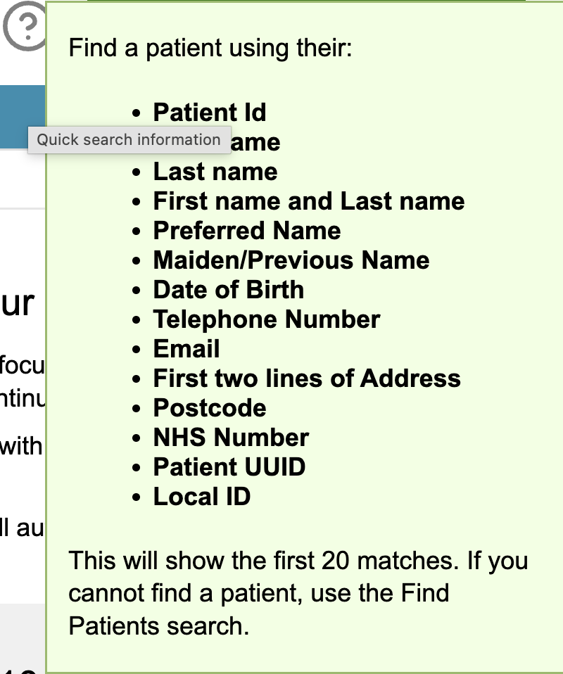 It will bring up the first 20 matches in a table, where it will show the Patient ID, Name, Date of birth and Address. To jump into the record, click on the required row.