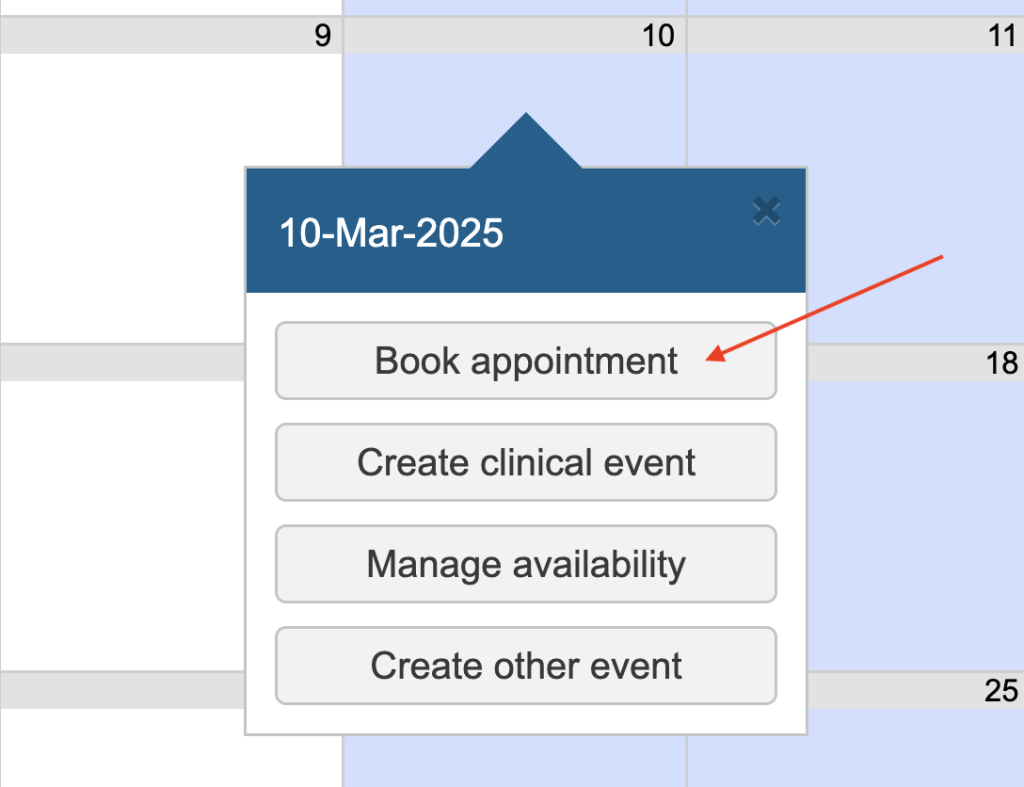 To book an appointment, simply click on the day you wish to add the appointment for. This will bring up a pop-up. Select the Book appointment option.