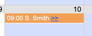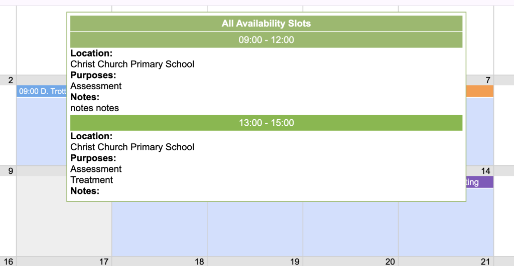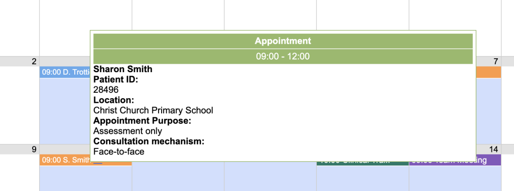 Once the appointment(s) has been saved successfully, the appointment will appear in orange. You can also hover over the appointment to find more information about it.