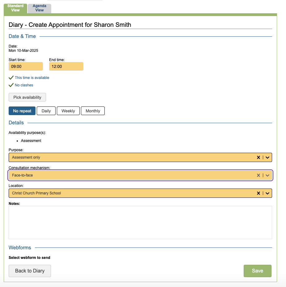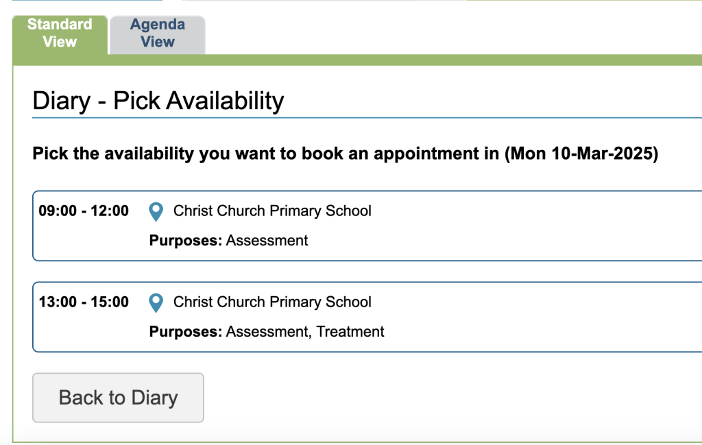 Appointments cannot be booked where there is no availability, where there is a personal event, or where there is an existing appointment or completed clinical contact. Please note however that appointments can be booked over incomplete contacts.