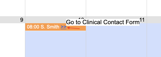 To quickly view the clinical contact for an appointment, click on the >> symbol next to the appointment entry and select Go to Clinical Contact Form