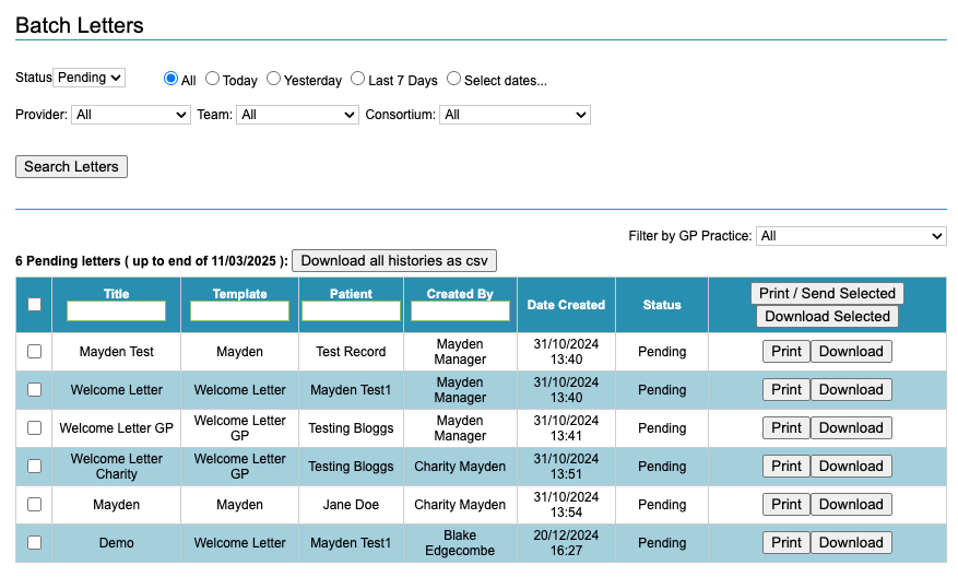 In the batch letters section admin users will be able to see all letters that have been added to the batch, by any user. Users with therapist accounts will only see letters they have created and added. When first viewing the Batch Letter area, the filters will default to display all pending letters i.e, those which have not been actioned.