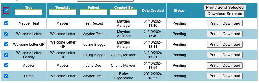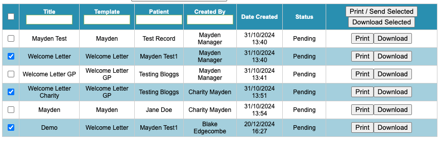 Multiple letters can be printed/sent or downloaded using the Print/Send Selected or Download Selected options in the header row. This can also be done for individual letters by clicking on their respective buttons.