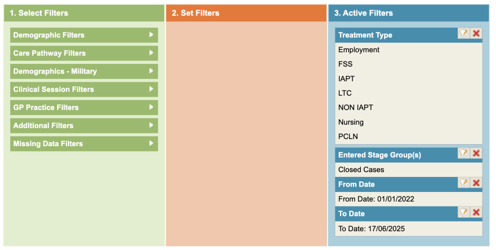 To see results just for discharged cases, select Care Pathway Filters – Entered Stage Groups and select the Group that represents Closed cases. (A Superuser can setup Stage Groups).