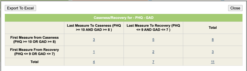 In the example below, we can see that 3 cases started and finished at caseness and 5 cases started at Caseness but finished as Recovered.