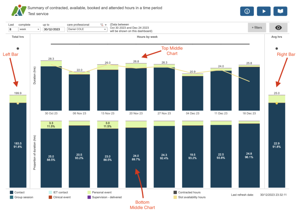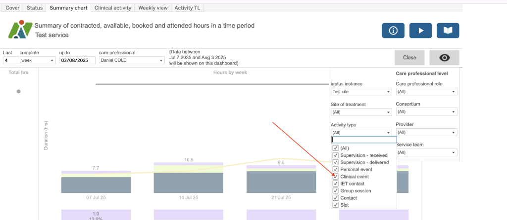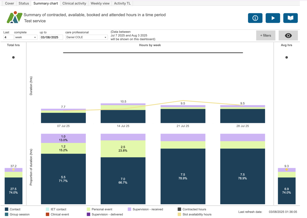 This gives a visual overview of the duration of activity entered in iaptus. You can select the number of days, weeks, months, quarters or years to view for all staff or particular care professionals. The data includes booked or clinical duration for contacts, group sessions, IET contacts, clinical events, personal events, and supervision both delivered and received.