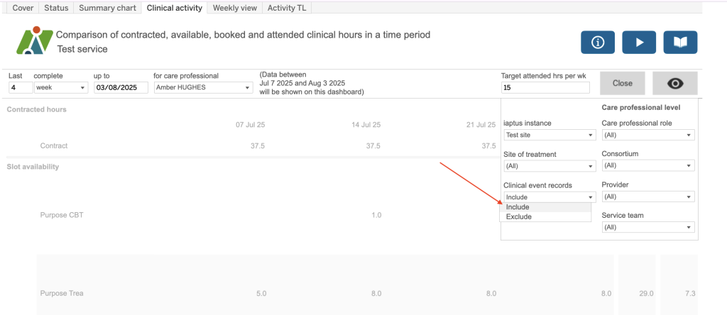 You can use the filter to include or exclude clinical event depending on how your service uses this feature. Majority of services use Clinical Events to record anonymous group session, for example running a workshop at a school or in a community where you do not know all the attendees. Other services use these as a catch all for admin tasks, in which case you may wish to exclude this type of activity.