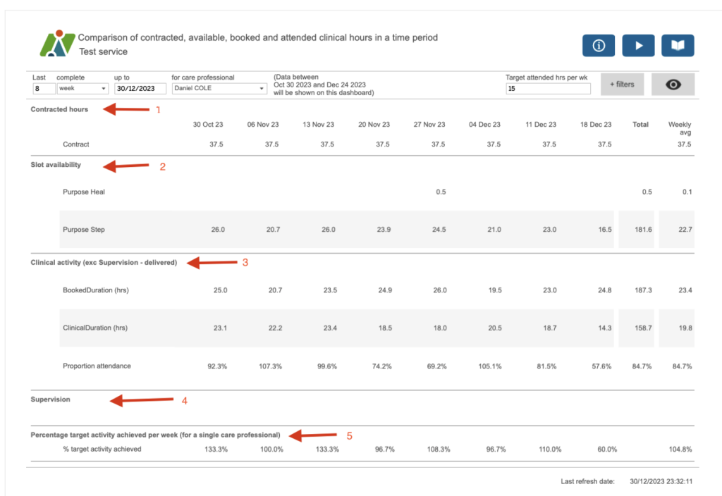 This shows Clinical Activity broken down by booked and Clinical Duration which are used to calculate the Proportion attendance. Please note; Supervision delivered is not included in this section and is reported separately below.