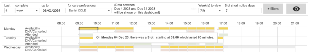 This Dashboard displays data as a Gant Chart or Timeline. If the time period select is weeks and a single care professional is being displayed and a single week is being viewed,you will get a weeks worth a data being displayed, shown below.