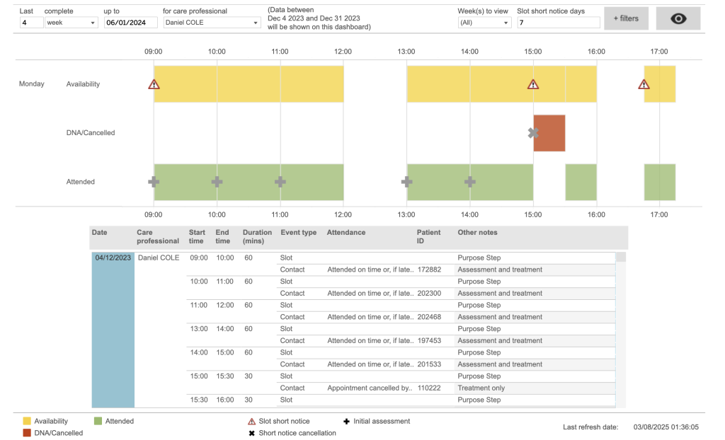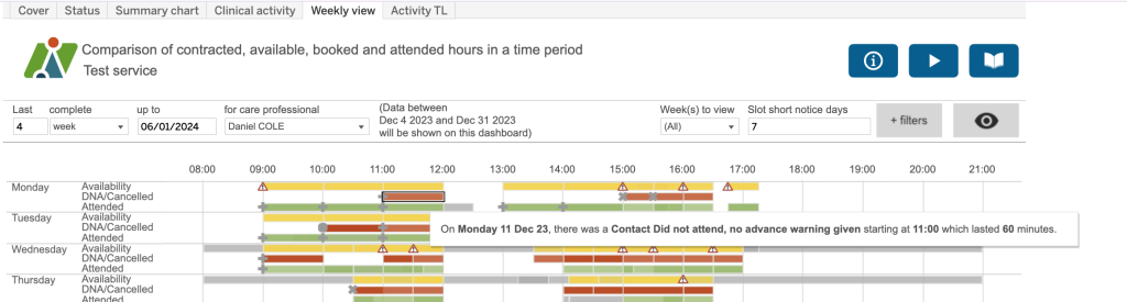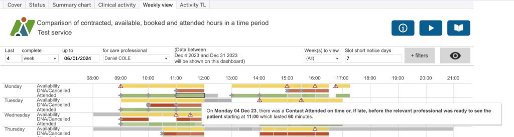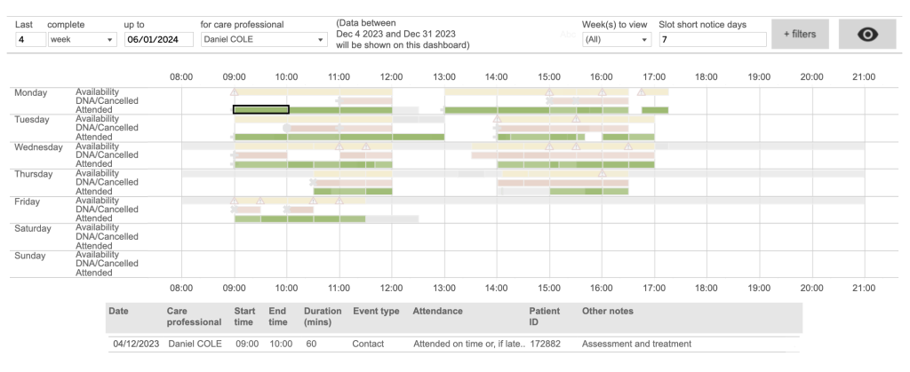 Shows a weekly view of the data displayed as a timeline. Quickly compare available slots created in iaptus against attended, DNA or cancelled contacts occurring in those slots. Slots created within 7 days of taking place (or a different length of time of your choice) are highlighted with a warning triangle. It is also possible to look ahead to see where activity has already been booked or where there is availability.