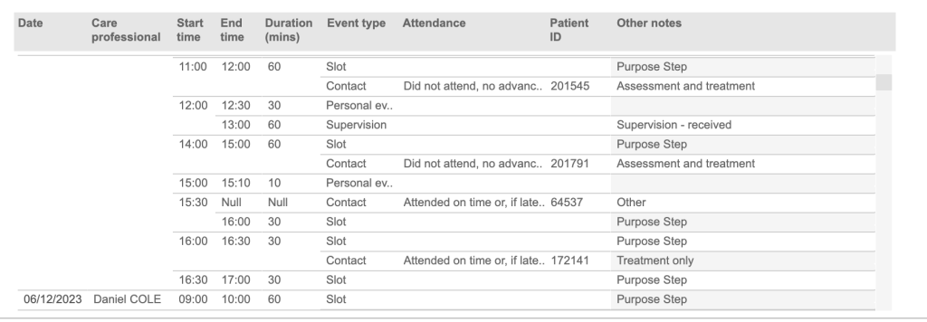 We can see below, that there was a DNA or Cancelled appointment at 11:00 and again at 15:00 . The length of the DNA or Cancelled session has been taken as the Booked duration rather than the Clinical duration, that would have been used if it was attended.