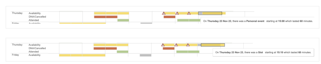 In this example, you can see on Thursday there are 2 colours. This is because there are 2 event overlaid at the same time. A personal event starting at 15:00 for 60 minutes and a Slot starting at 15:10 for 60 minutes. This can also be seen in the table underneath.