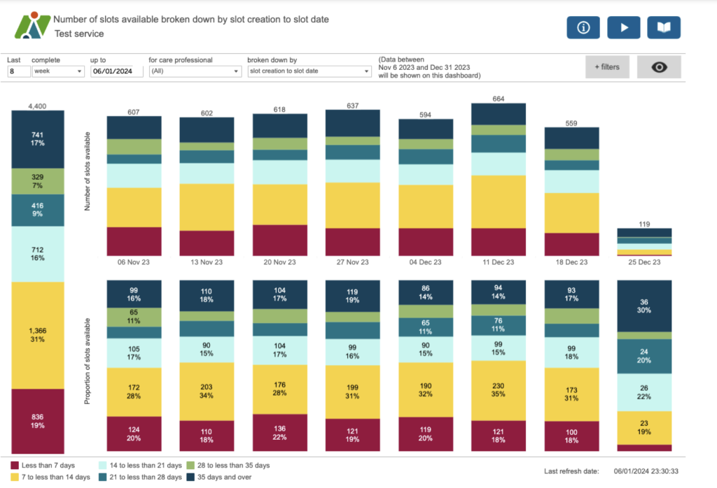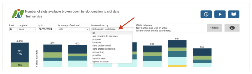 This dashboard explores the total number (rather than duration) of slots created in iaptus. By default, this is broken down by time from slot creation date to the slot date, and can also be broken down by various other dimensions by selecting from a menu.