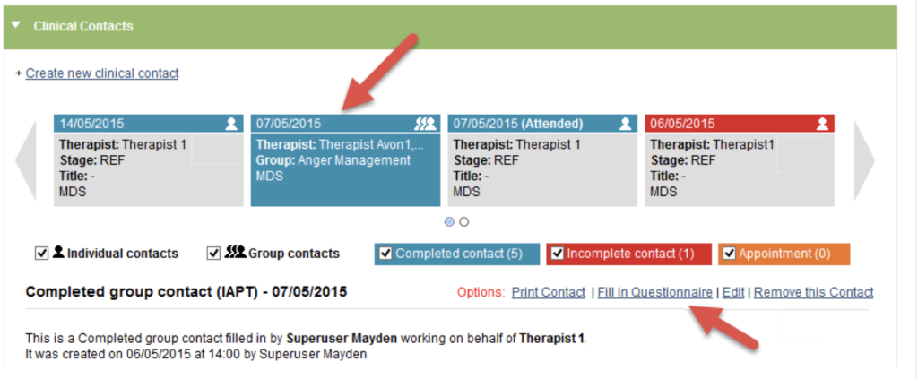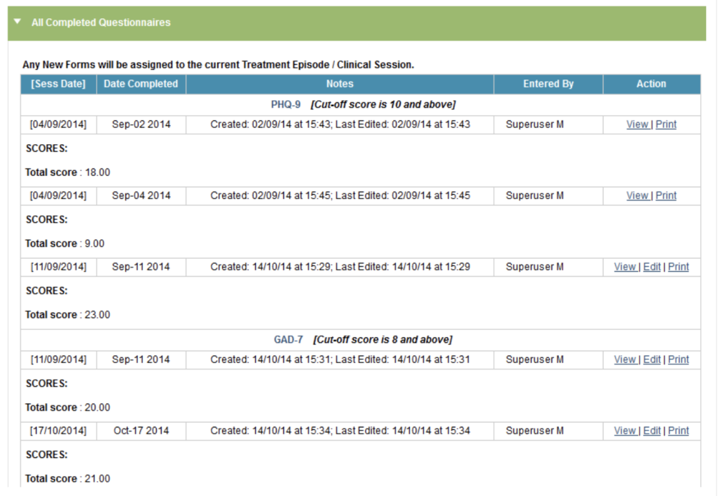 Once the questionnaire is complete, the results will show in All Completed Questionnaires and the score will populate in the clinical contact if appropriate.