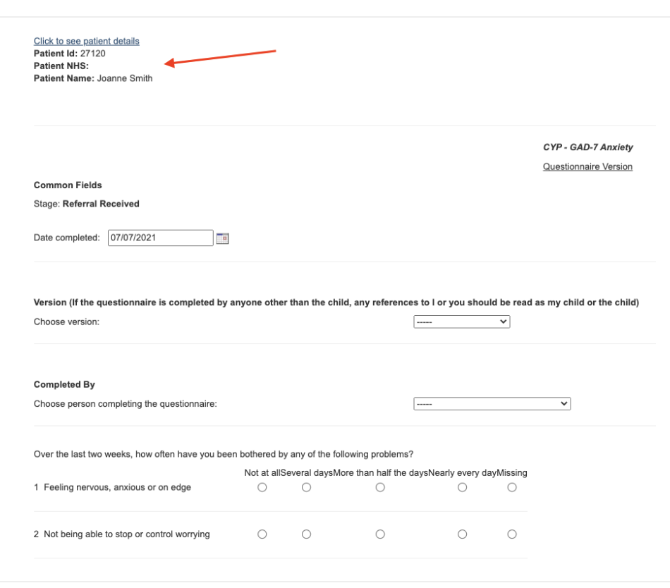 At the top of questionnaire there is a hyperlink to view the patient details, to confirm you are completing the questionnaire for the right patient.