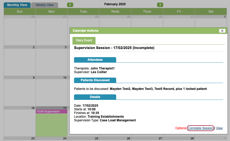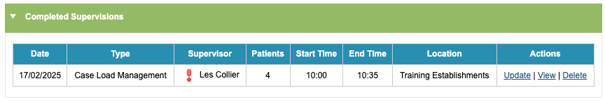 Both supervisors and supervisees should save and mark their session as completed. The supervision session will move the from Planned Supervisions to Completed Supervision. Here the session can be updated, viewed or deleted.