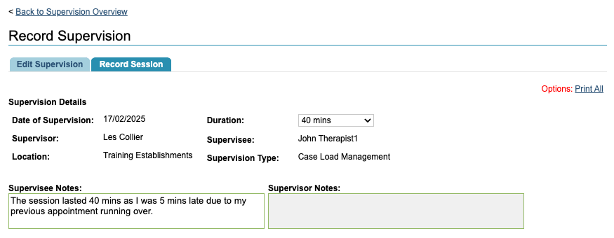 At the top of the Record Supervision screen you can see the Supervision details. Here you can update the duration and the overall notes if needed.