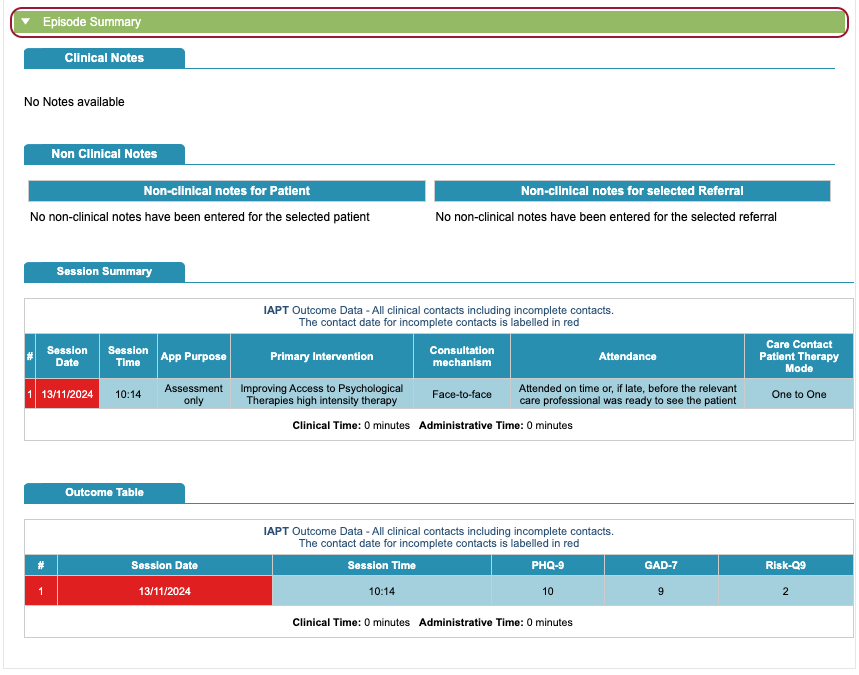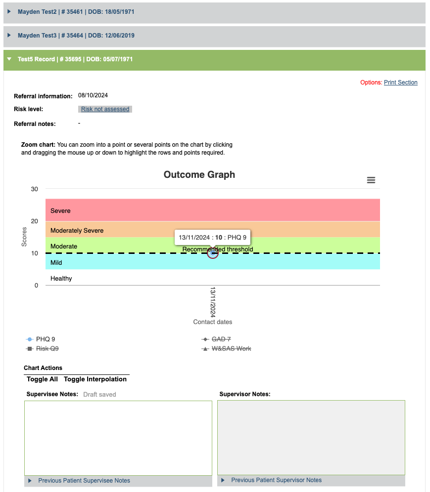 At the top of each patient section you can see their referral information, risk, referral notes and the Outcome Graph showing recorded scores.