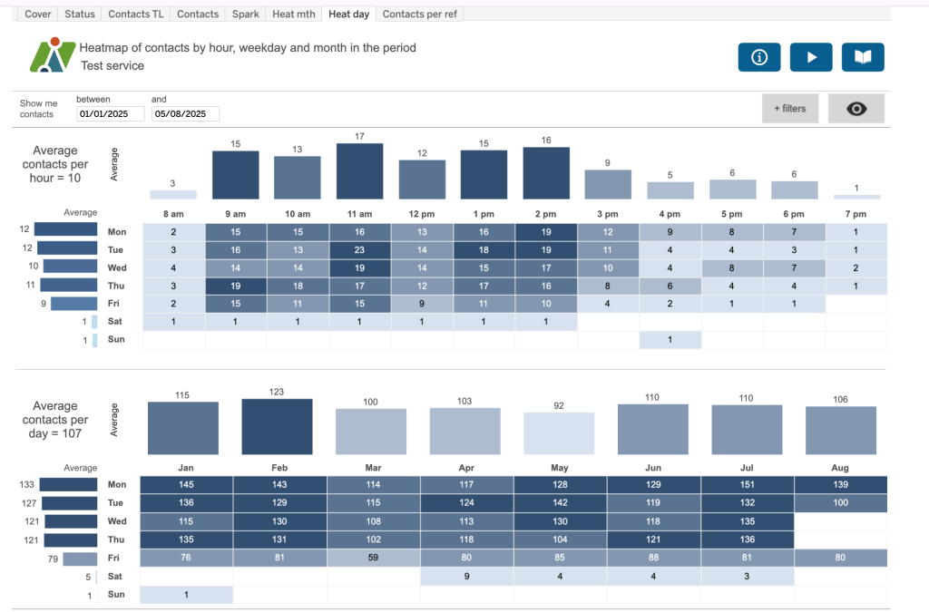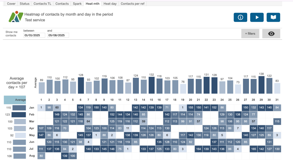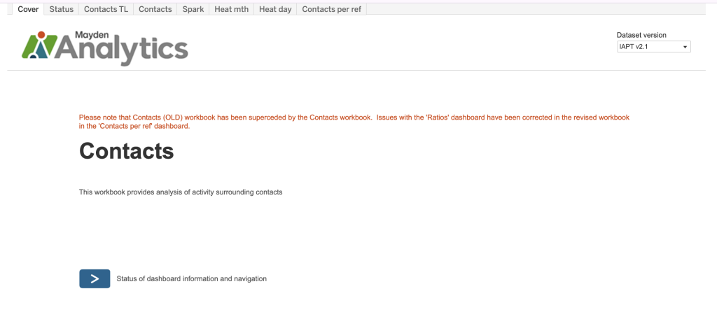 Please note that Contacts (OLD) workbook has been superceded by the Contacts workbook. Issues with the ‘Ratios’ dashboard have been corrected in the revised workbook in the ‘Contacts per ref’ dashboard.