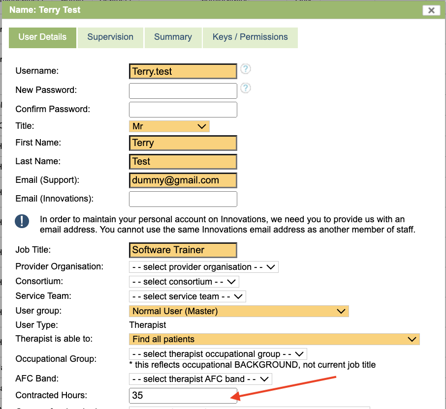 When enabled, an additional field Contracted Hours field shows against a Therapist user to record contracted hours. Contracted hours is used in the dashboard area of iaptus.