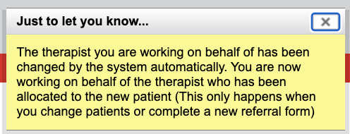 When enabled, each time an admin user selects a patient, they will not have to then select the new therapist to work on behalf of because iaptus will do this automatically and this message will be displayed to inform you.