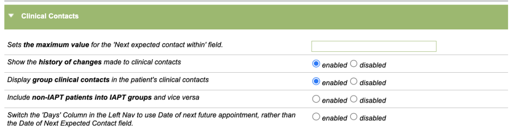 The Clinical Contacts section includes specific options for the clinical contact settings.