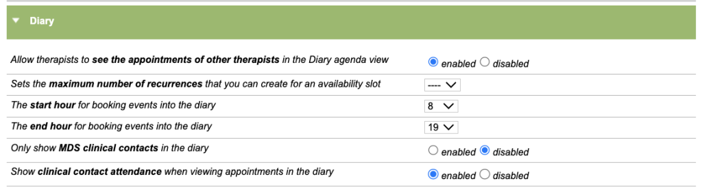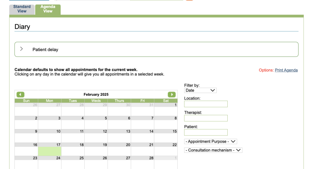 The Agenda View tab shows at the top of the therapist’s diary. This option will allow the service to decide if a therapist can only see their own appointments or also those of other therapists within the Agenda View.