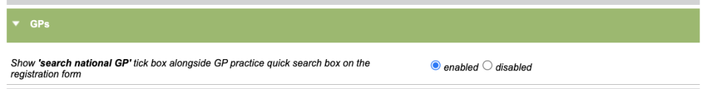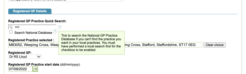 The GP Practice search on a patient record only includes the practices switched on by a Superuser. This setting expands the search to a national level, based on the latest GP list from NHS England.