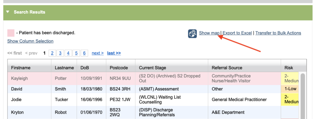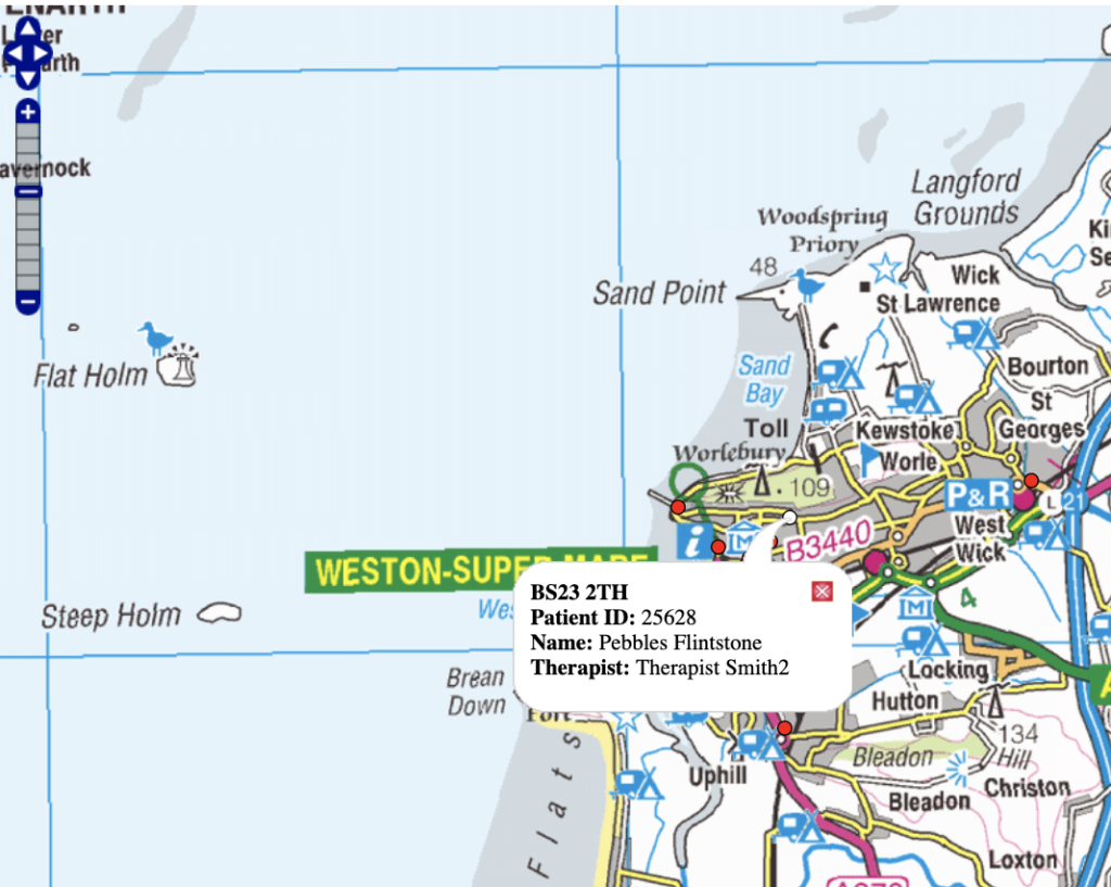 On the map referrals are represented by a red dot. Clicking on the red dot will display the postcode, patient ID, name and therapist.