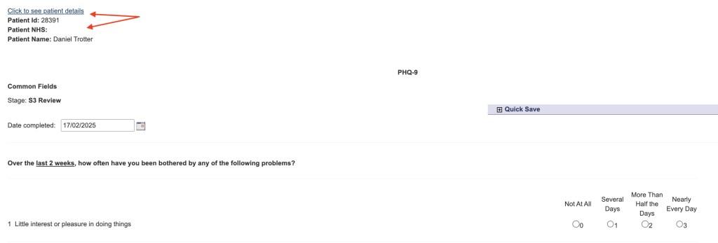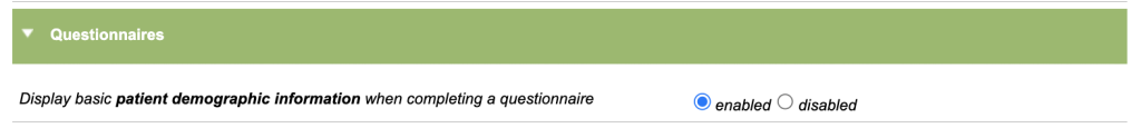 This option adds a hyperlink to questionnaires. When clicked it will display the patient’s iaptus ID, NHS number and full name at the top of the questionnaire.