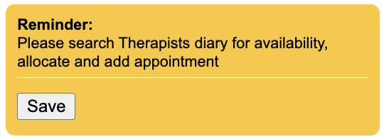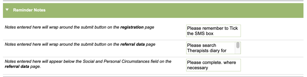 Reminder notes can be added around the save buttons of the registration and referral forms. These will be visible every time you go to save one of these forms. They can be used for customer prompts/reminders for your staff.