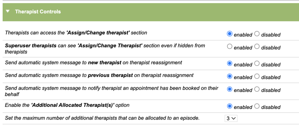 This option allows you to control the number of additional therapist you can allocate to an episode, to a maximum of eight.