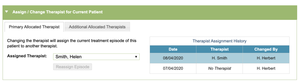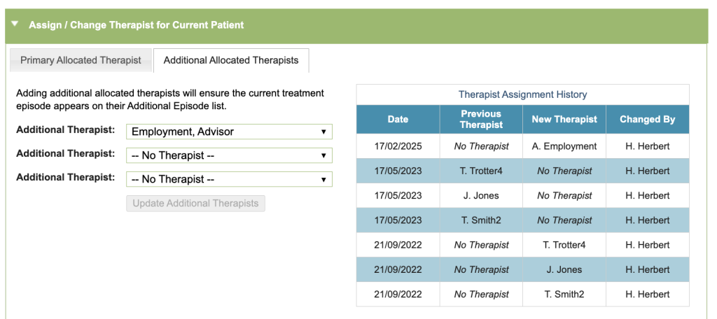 Enabling this options allows multiple therapists to be allocated to each patient. If enabled, there will be a new ‘Additional Allocated Therapists’ tab under the ‘Assign/Change Therapist’ section (as shown in the screenshot below). You can have up to eight additional allocated therapists.