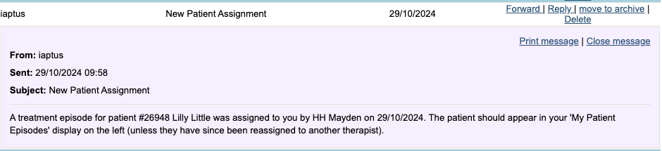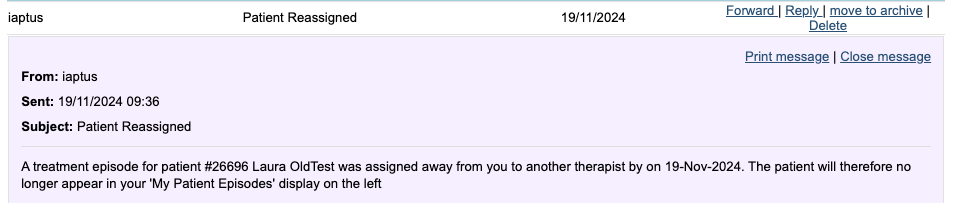 If enabled, the newly allocated therapist will receive an automatic message under Messages, informing of a new patient in their caseload.