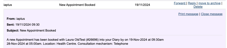 If enabled, the therapist will receive an automatic message in Messages informing them an appointment has been booked in their diary.