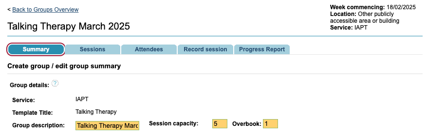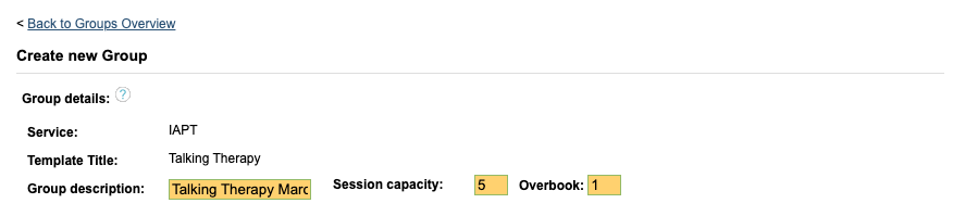 The service type and template title will be pulled through from the group template and you can update or change the group description. You will need to complete the session capacity and overbook fields. The total number of attendees that can be added and therefore attend the session are the session capacity plus overbook places so be prepared to accommodate this total number.
