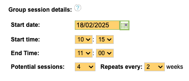 Potential sessions is the number of sessions that the group will be created with, You can always reduce this or add more sessions later. The repeat option will determine how often the sessions are, ranging from weekly, to one session every 10 weeks.