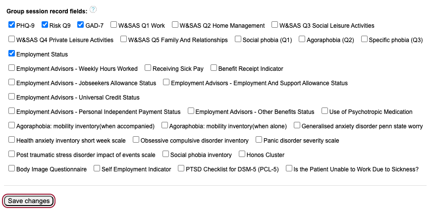Below, you will then have the Group session record fields. Here, you are selecting information to record at the group session. Tick the options that apply for your group. Once you are happy and ready to save this group, click Save.