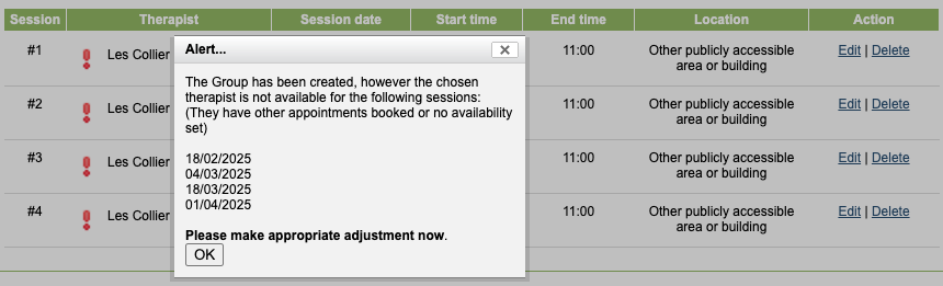 Unlike patient individual appointments, iaptus does not require the therapist to have availability first for the group sessions to be booked into. If the therapist has not made themselves available first, a message will pop up to alert you of this so you can check that the therapist is available to attend this group and they have no other clashing commitments.